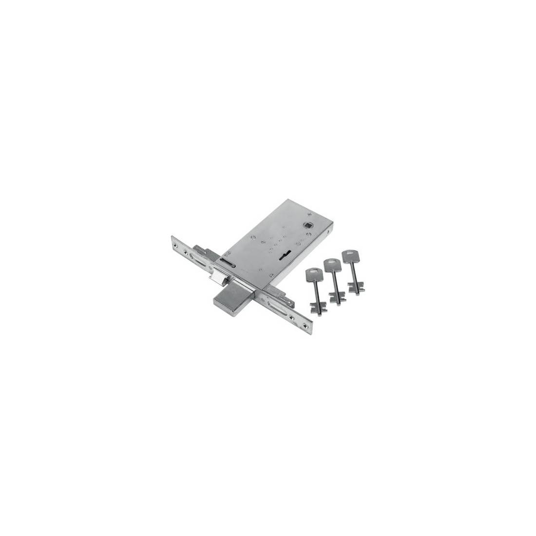 A doppia mappa. Con scrocco reversibile. Chiusura triplice con catenaccio a 4 mandate e asole per montaggio aste. Frontale in acciaio inox con bordo quadro da Mm. 25x240. Altezza scatola Mm. 81. In dotazione: 3 chiavi.