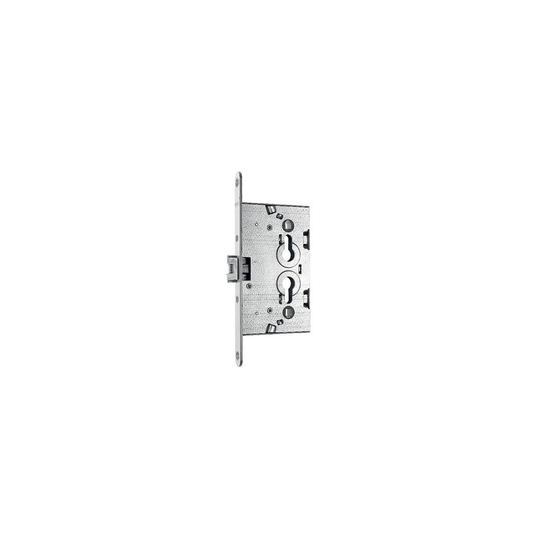 Per doppio cilindro sagomato. Scrocco reversibile con catenaccio incorporato. Chiusura a 1 mandata. Quadro maniglia Mm. 8. Frontale in acciaio zincato con bordo tondo da Mm. 20x235. Altezza scatola Mm. 160. Per cantina.