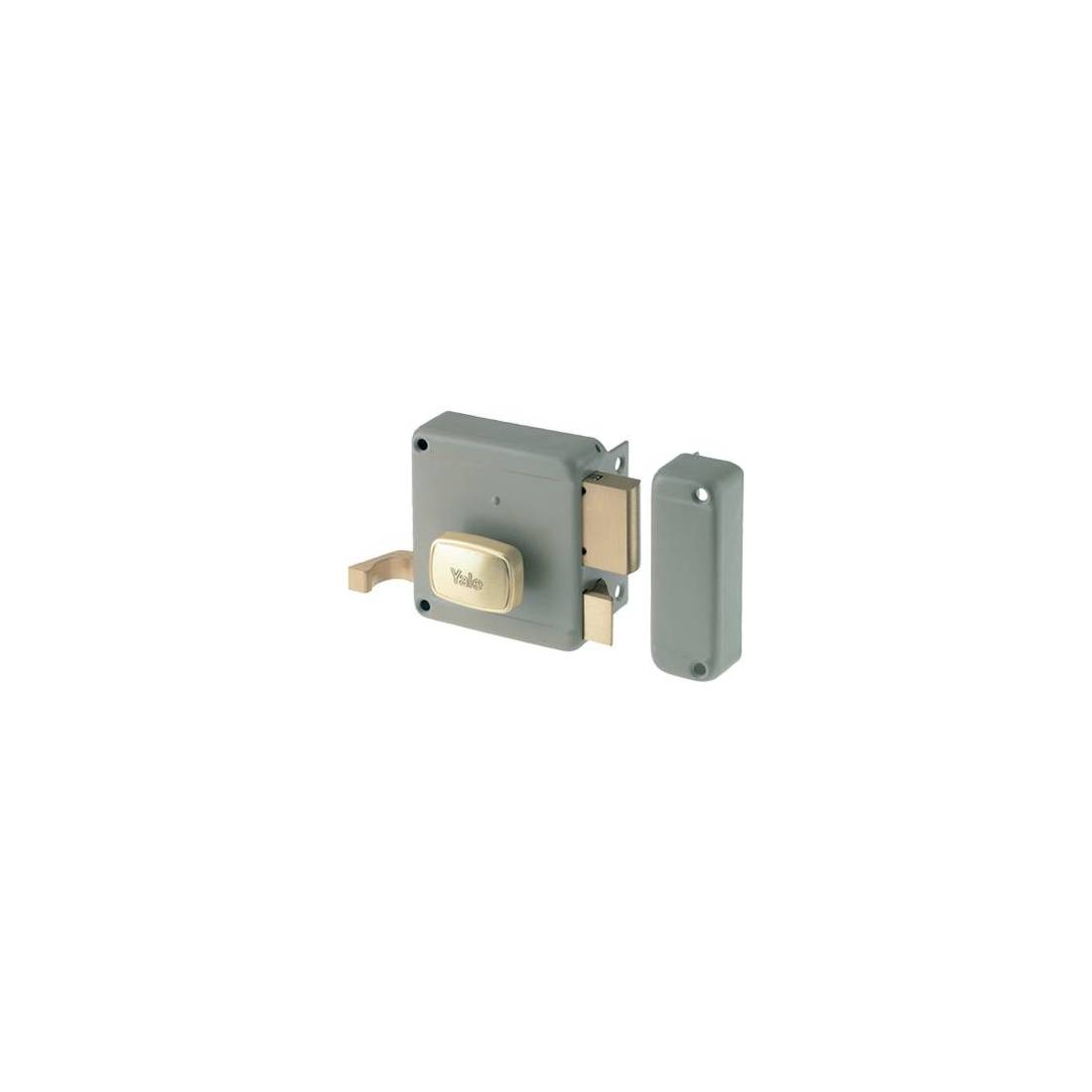 Con cilindro esterno staccato. Scrocco azionato dall\'esterno mediante chiave e dall\'interno mediante tirante. Pomolo interno. Chiusura a catenaccio a 2 mandate azionato mediante pomolo dall\'interno e chiave dall\'esterno. Scatola Mm. 80x85. Bocchetta Mm. 32x85. In acciaio verniciato. In dotazione: 3 chiavi piatte e 1 bocchetta.