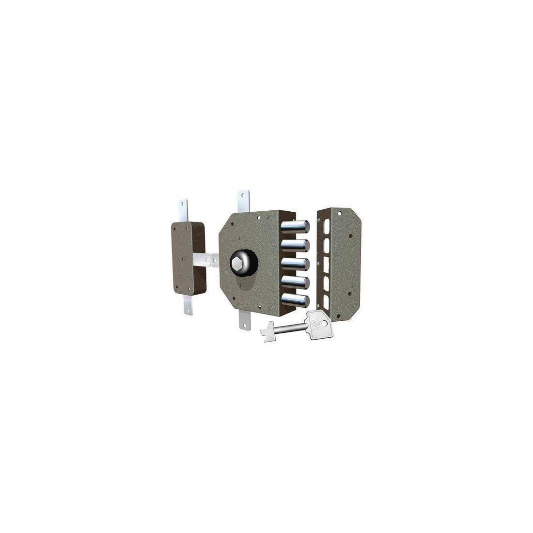 Con cilindro a pompa sul lato esterno e calotta sul lato interno. Chiusura quintupla con catenaccio a 5 pistoni e 4 mandate, corsa Mm. 38, e predisposizione fissaggio aste e deviatore. Scatola Mm. 130x164. Bocchetta Mm. 49x164. In acciaio verniciato. In dotazione: 3 chiavi, 1 deviatore aste, 1 ferrogliera, 1 mostrina e viti.
