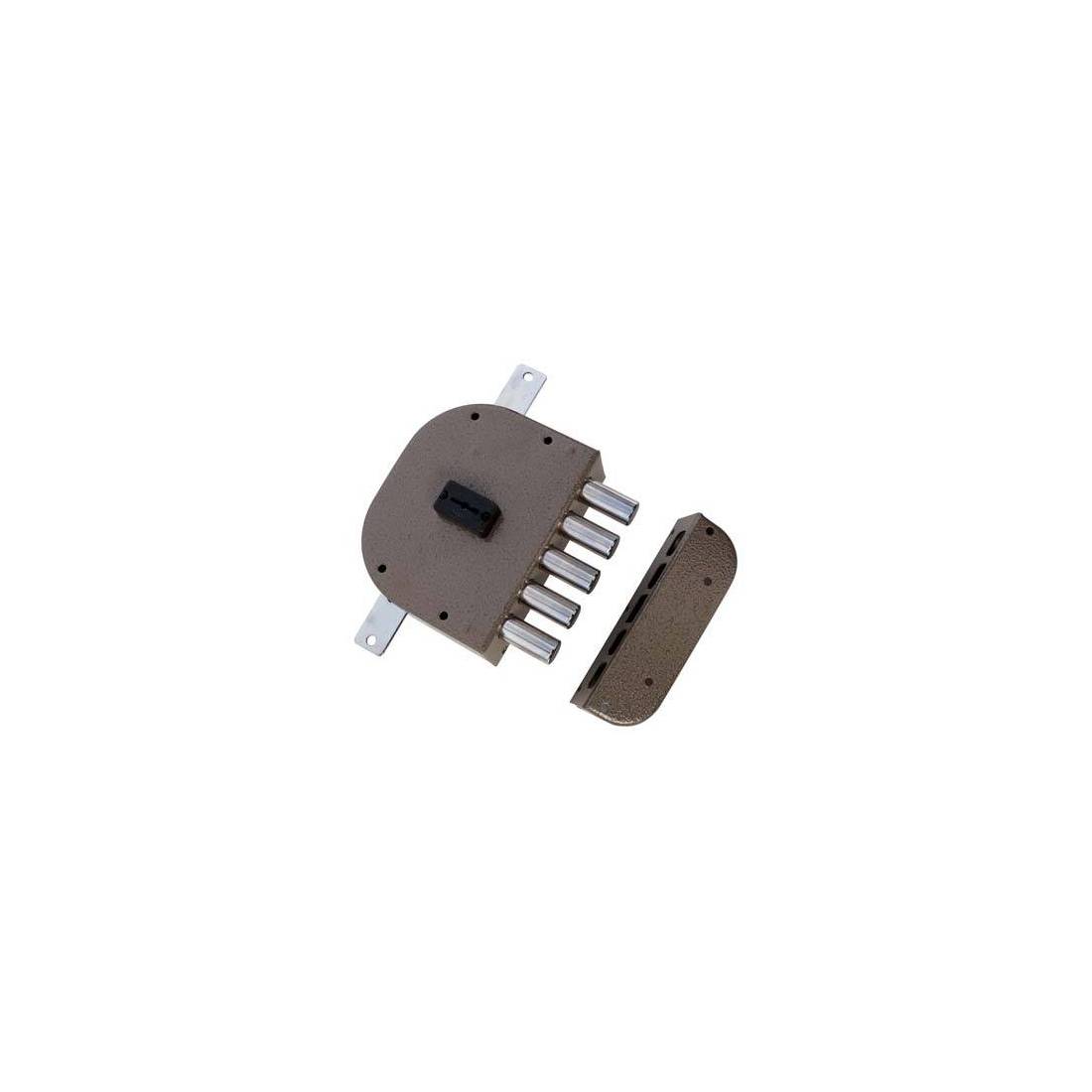 A doppia mappa. Chiusura triplice con catenaccio a 5 pistoni e 4 mandate, corsa Mm. 38, e predisposizione per fissaggio aste. Piastra corazzata. Scatola Mm. 130x164. Bocchetta Mm. 49x164. In acciaio verniciato. In dotazione: 3 chiavi, 1 ferrogliera, 1 mostrina, 1 canotto, 1 astuccio guida chiave e viti.
