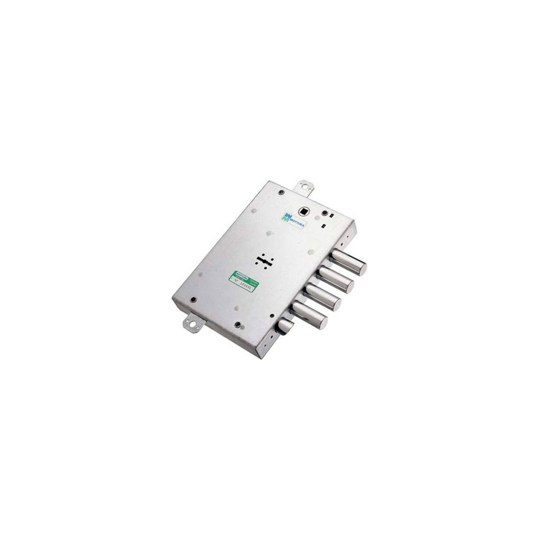 A doppia mappa. Scrocco reversibile, azionabile da chiave o maniglia. Chiusura triplice con catenaccio a 4 pistoni e 4 mandate, corsa Mm. 40, e predisposizione per fissaggio aste, corsa Mm. 20. Quadro maniglia Mm. 8, interasse Mm. 85. Scatola Mm. 136x206. In acciaio zincato. In dotazione: 3 chiavi.