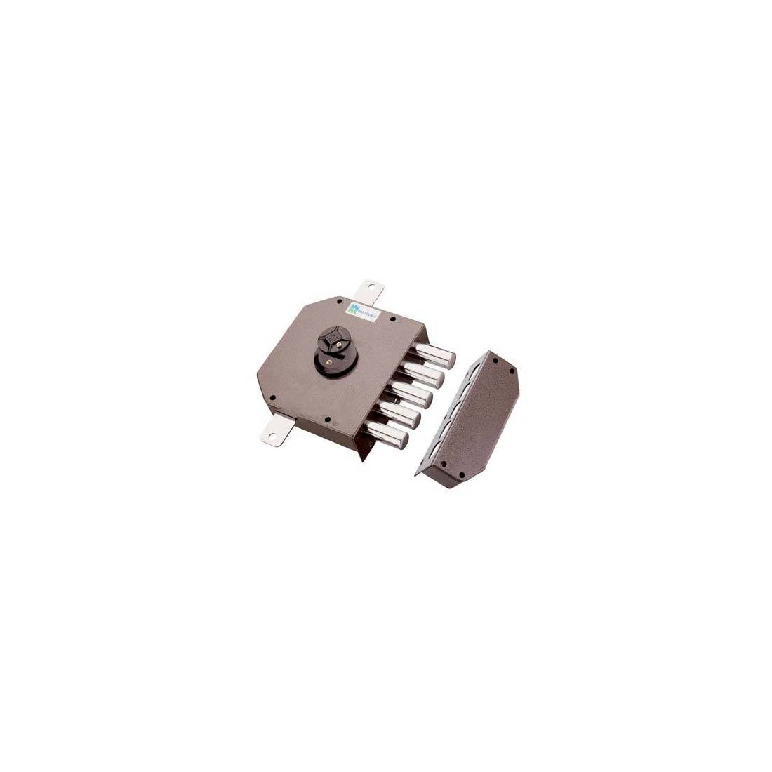 A doppia mappa. Chiusura triplice con catenaccio a 5 pistoni e 4 mandate, corsa Mm. 40, e predisposizione per fissaggio aste, corsa Mm. 17. Scatola Mm.132x146. In dotazione: 3 chiavi, 1 mostrina, 1 ferrogliera, 2 passanti aste, 1 cavallotto, 1 bocchetta a pavimento e viti per il montaggio.