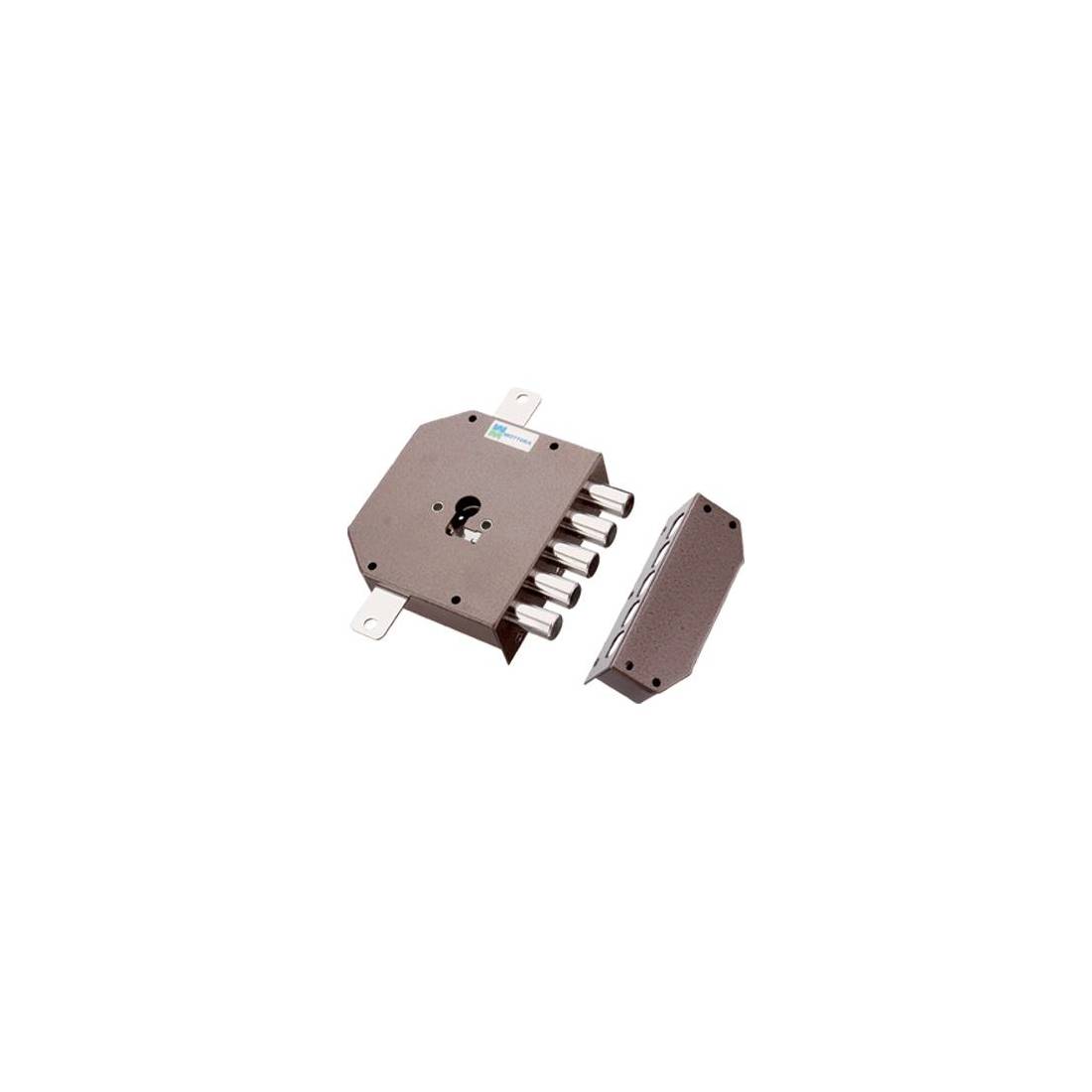 Per cilindro sagomato. Chiusura triplice con catenaccio a 5 pistoni e 2 mandate, corsa Mm. 29, e predisposizione per fissaggio aste, corsa Mm. 17. Scatola Mm. 132x146. In acciaio verniciato.
