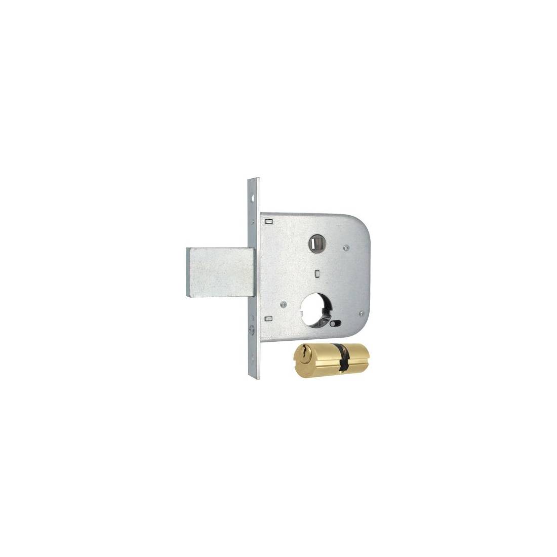 Con cilindro tondo da Mm. 26 di diametro. Scrocco in acciaio con mandata singola. Scatola Mm. 95x96. Frontale a bordo quadro in acciaio zincato da Mm. 20x145. Quadro Mm. 8. In dotazione: 3 chiavi piatte.