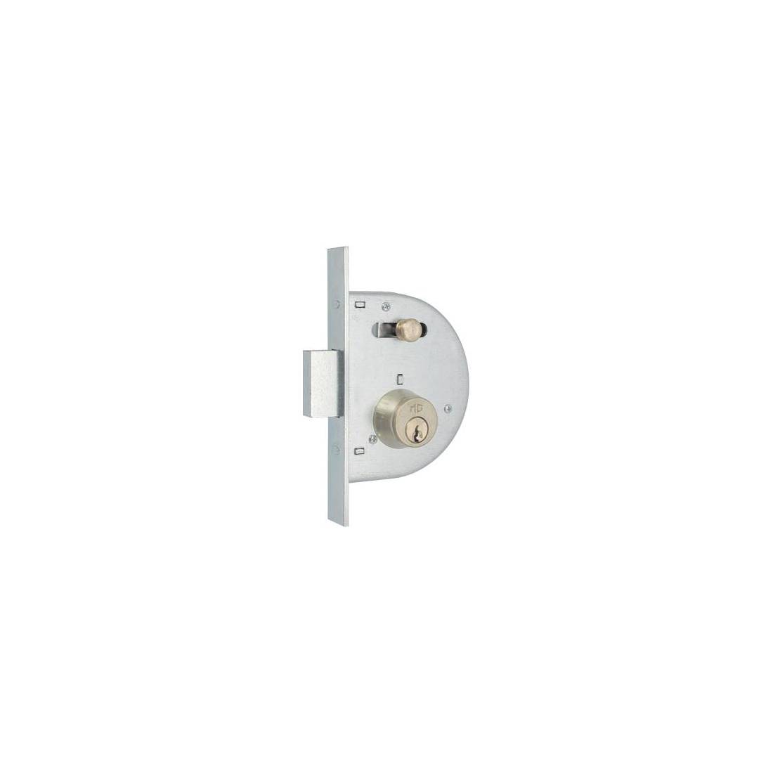 Con cilindro tondo da applicare da Mm. 25/33 di diametro. Scrocco ad 1 mandata con pomolino, catenaccio in acciaio. Scatola Mm. 82x103. Frontale a bordo quadro in acciaio zincato da Mm. 20x146. In dotazione: 3 chiavi piatte.