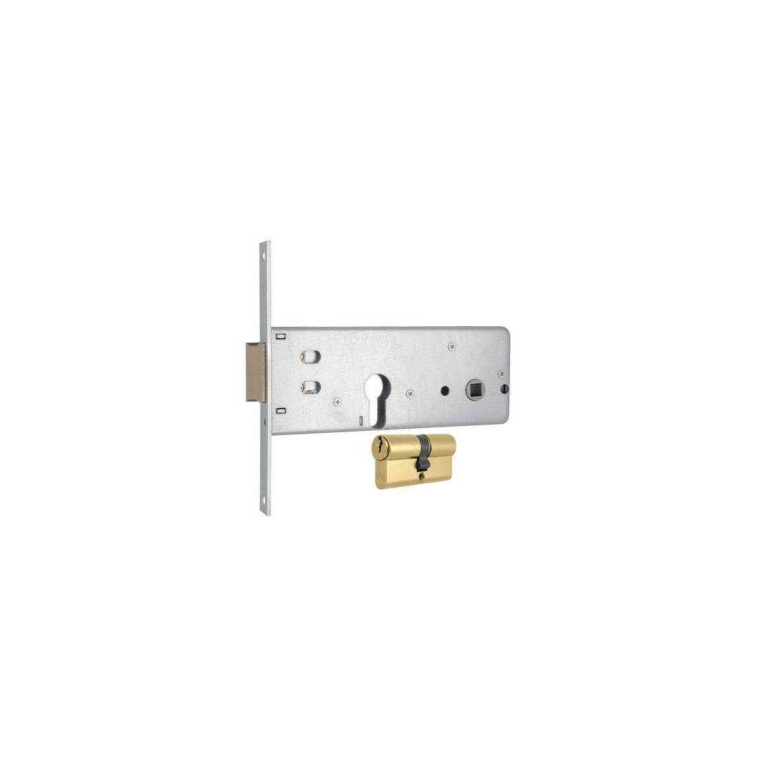 Con cilindro sagomato. A 2 mandate e scrocco, catenaccio in ottone. Scatola Mm. 164x64. Frontale a bordo quadro in acciaio zincato da Mm. 20x160. Quadro Mm. 8. Entrata Mm. 70. Con 3 chiavi piatte in dotazione.