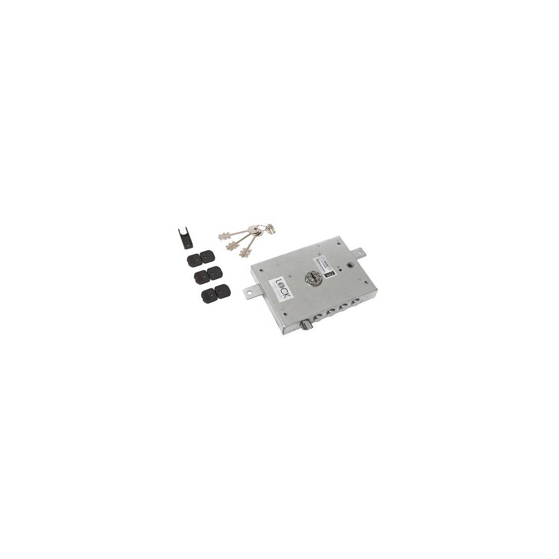 A doppia mappa. Scrocco azionabile da chiave o maniglia. Chiusura triplice con catenaccio a 4 pistoni e 4 mandate, corsa Mm. 42, e predisposizione per fissaggio aste, corsa Mm. 18. Quadro maniglia Mm. 8, interasse Mm. 85. Scatola Mm. 142(152)x206. In acciaio zincato. In dotazione: 3 chiavi e 1 chiave da cantiere. In scatola.