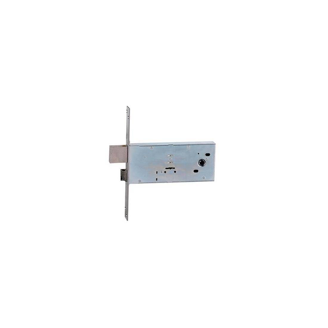 A doppia mappa. Scrocco reversibile. Chiusura con catenaccio a 4 mandate. Quadro maniglia Mm. 8. Frontale in acciaio zincato con bordo quadro da Mm. 25x240. Altezza scatola Mm. 82. In dotazione: 2 chiavi, 2 ghiere e viti di fissaggio.