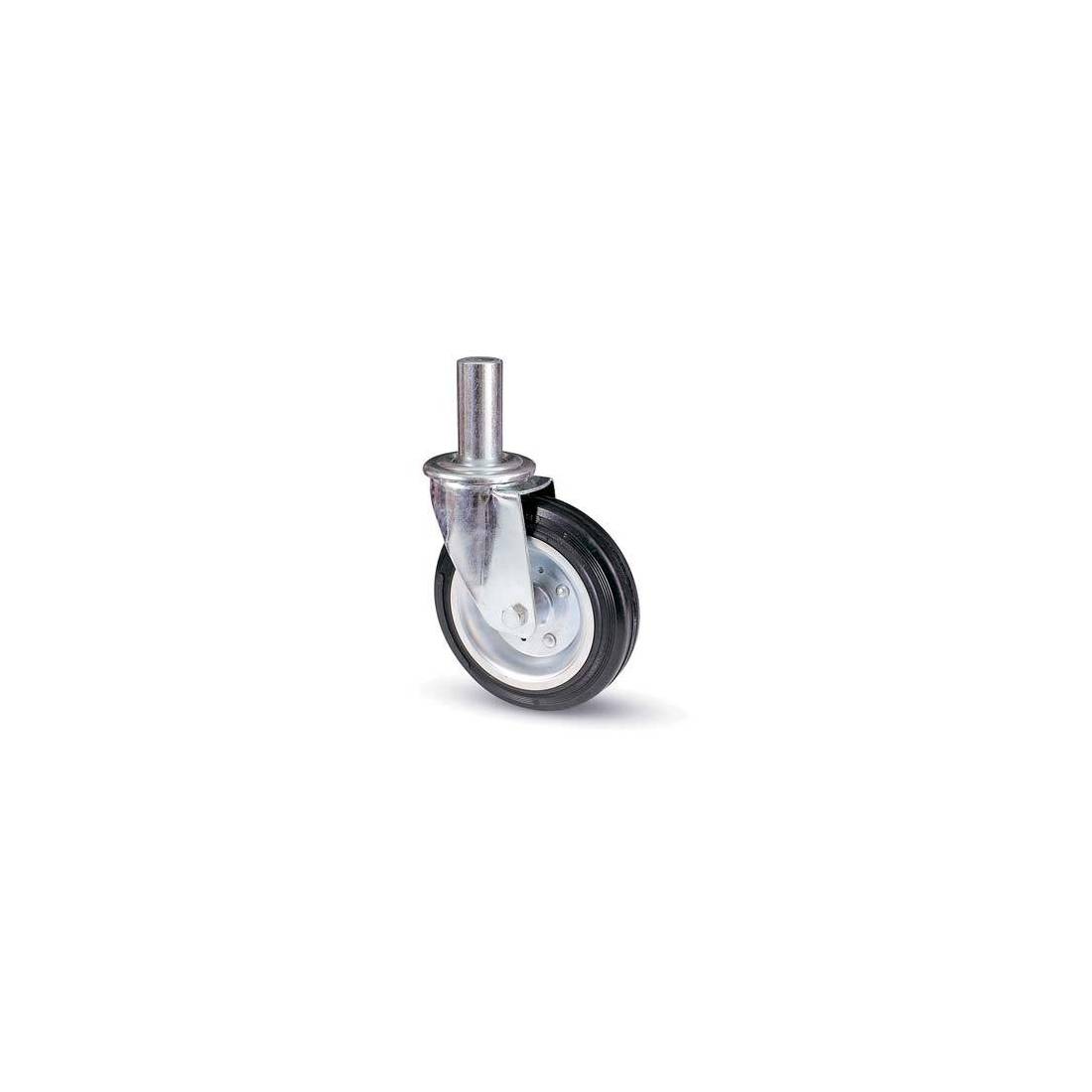 Supporto in acciaio stampato zincocromato ruotante su doppia corona di sfere. Assemblaggio con dado autobloccante. Nucleo in acciaio. Mozzo su cuscinetti gabbia a rulli. Perno Mm. 22x50 per tubi innocenti.