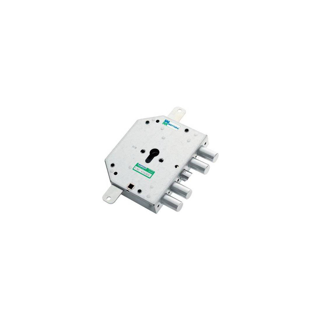 Per cilindro sagomato. Scrocco azionabile da chiave o maniglia. Chiusura triplice con catenaccio a 4 pistoni e 4 mandate, corsa Mm. 29, e predisposizione per fissaggio aste, corsa Mm. 14. Quadro maniglia Mm. 8, interasse Mm. 71,8,5. Scatola Mm. 164,4x130,4.