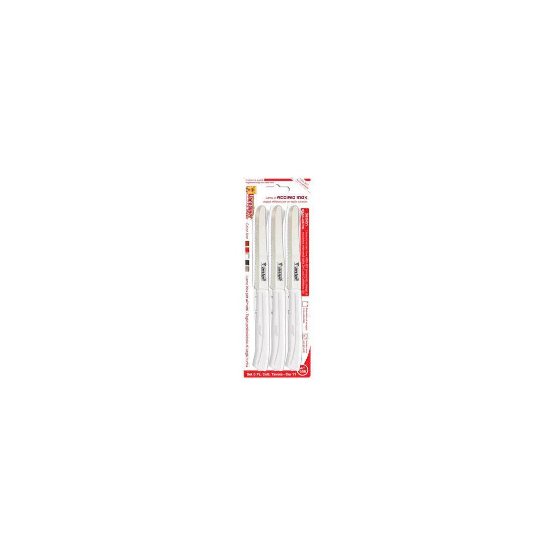 Lama dentata in acciaio inox con doppia affilatura. Manico in materiale plastico.