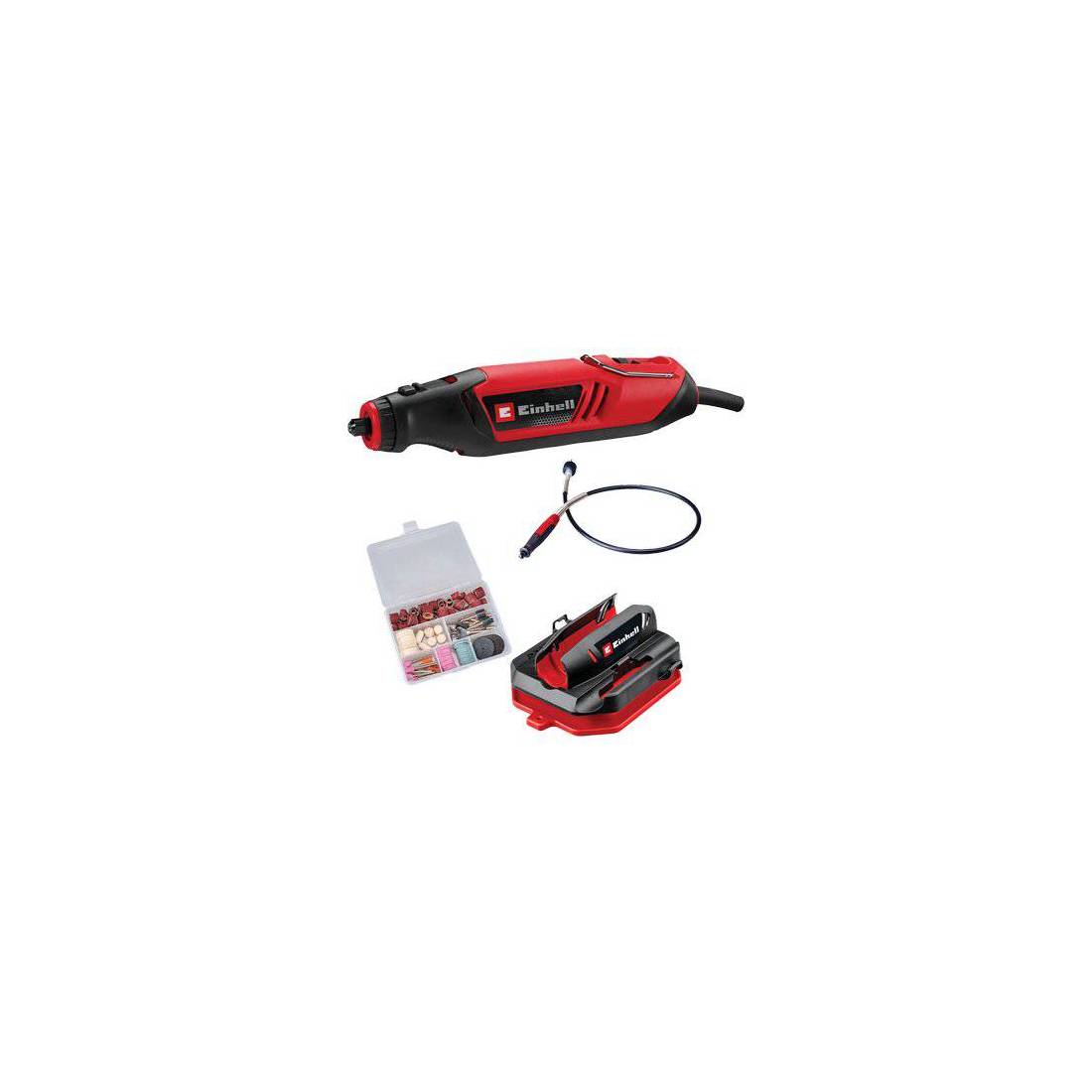 Per fresare, tagliare, forare, levigare e lucidare. Regolazione del numero di giri al minuto da 10.000 a 35.000. Impugnatura antiscivolo. Bussole di serraggio da Mm. 1,6-2.4-3,2 di diametro. Completo di albero flessibile da Mt. 1, supporto e 117 accessori assortiti (lucidatura, levigatira, taglio e foratura).