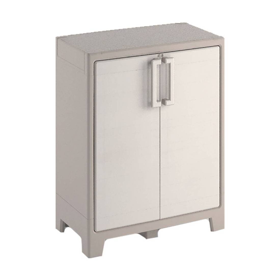 In plastica. Con doppio ripiano. Portata per ripiano 30kg. Dotato di robuste cerniere in metallo. Soluzione compatta, ideale per ottimizzare gli spazi all'interno e all'esterno della casa. Resistente agli agenti atmosferici IP43.
