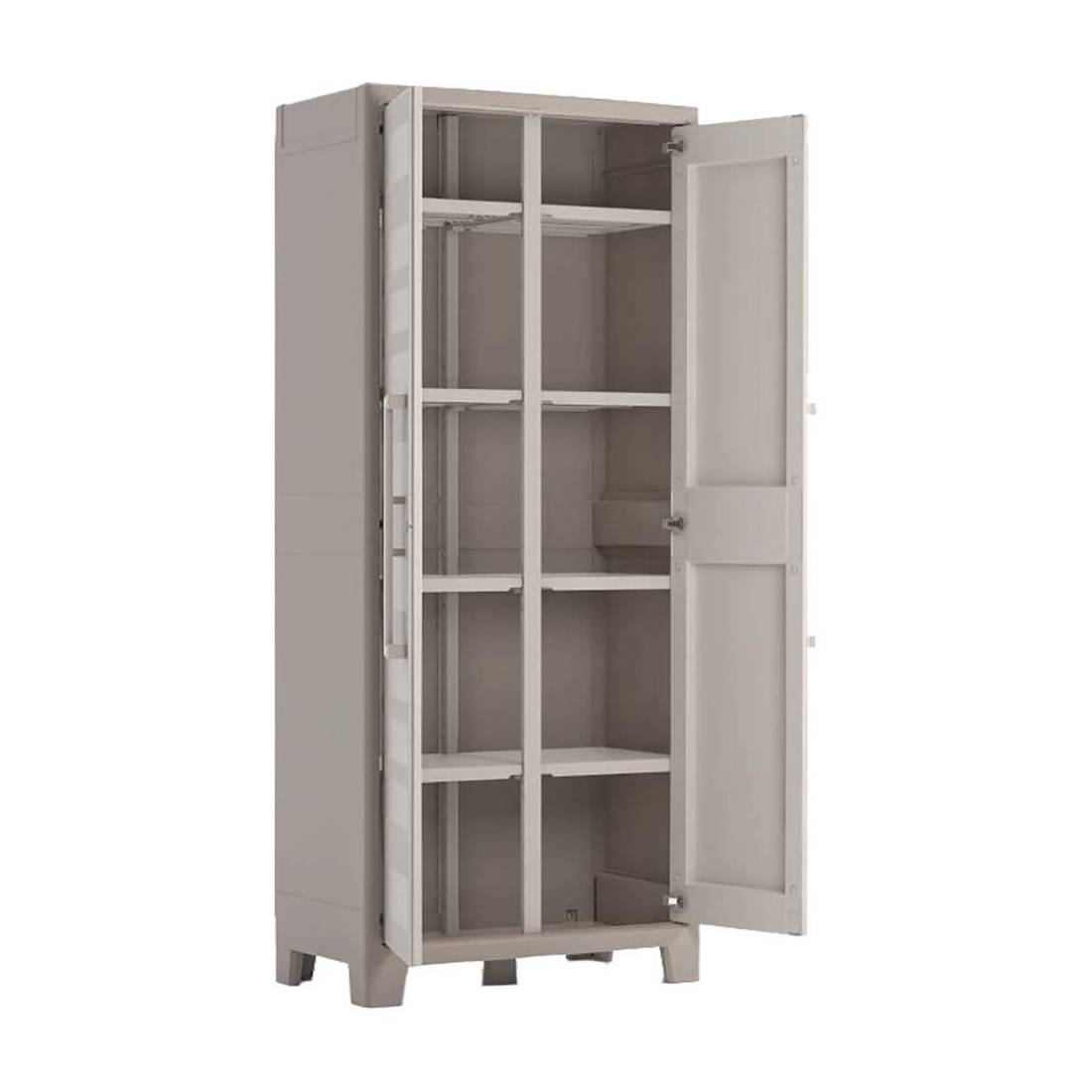 In plastica. Con 8 ripiani ribaltabili a 90° che permettono di creare diverse combinazioni per l'organizazzione dello spazio interno. Portata 15 kg a ripiano, piedini regolabili. Prodotto anti pioggia, è dotato di robuste cerniere in metallo. Soluzione compatta, ideale per ottimizzare gli spazi all'interno e all'esterno della casa.