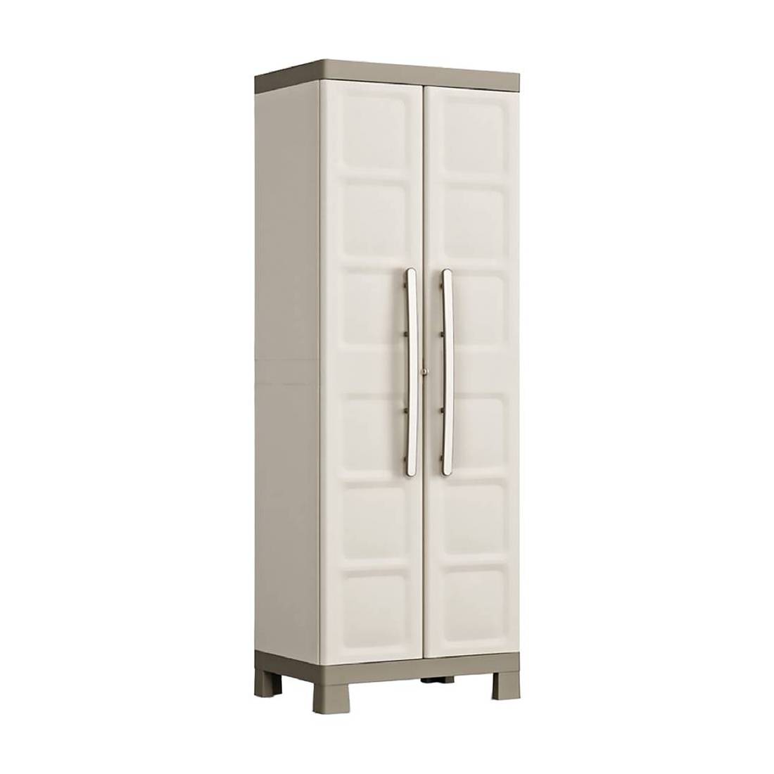 In plastica. Con 4 ripiani, portata 15 kg a ripiano, piedini rialzati e scaffali regolabili. Lucchettabile, maniglioni ergonomici. Soluzione compatta, ideale per ottimizzare gli spazi all'interno e all'esterno della casa. Prodotto certificato EN14749.