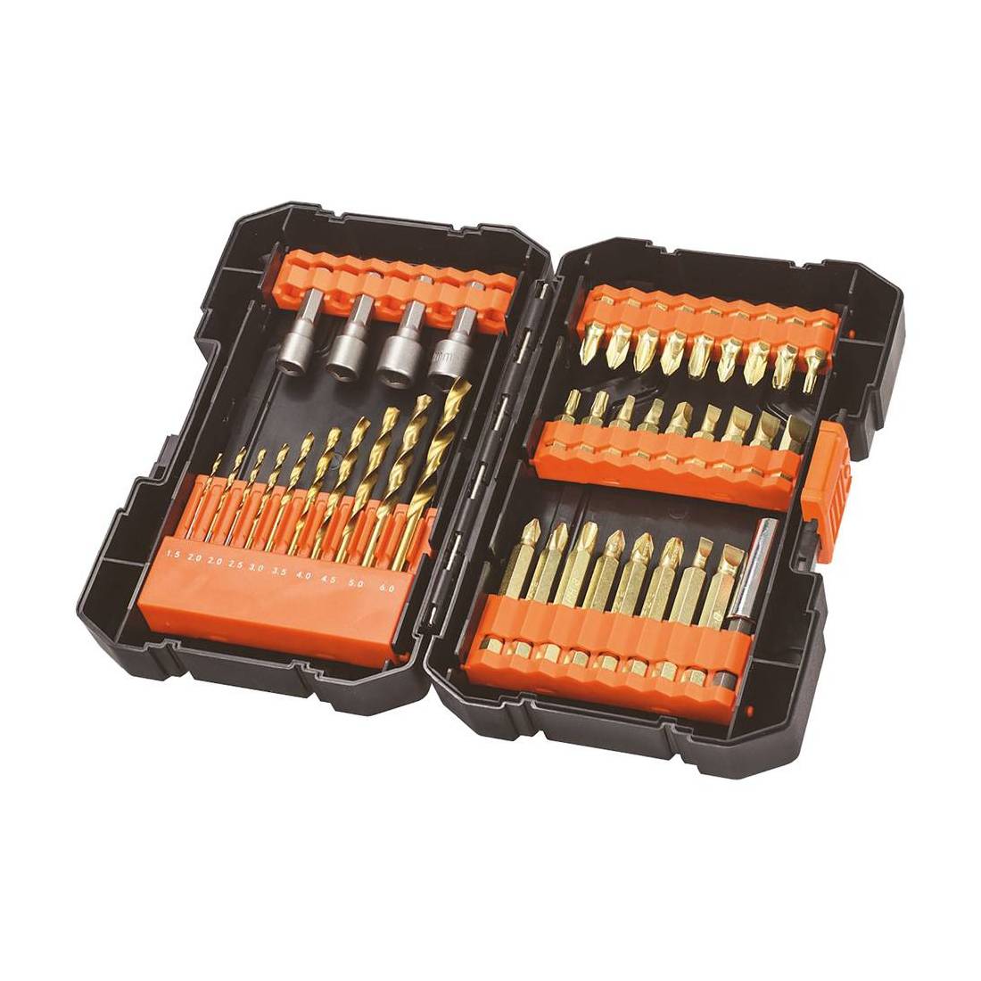 In custodia plastica. Composizione: 18 inserti da 25 mm (PZ-PH-SL-TX-SQ), 8 inserti da 50 mm (PZ-PH-SL), 4 bussole (6-7-8-9 mm), 10 punte metallo (da 1,5 a 6 mm). Con 1 adattatore megnetico.
