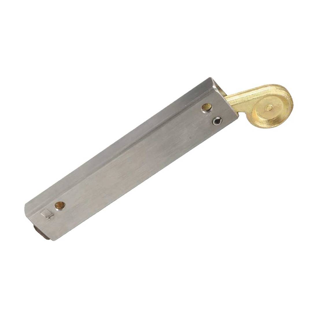 Realizzato in ferro zincato con leva in ottone. Applicazione a vite o a saldare, per cancelli a 2 ante. Sezione mm 30x15.