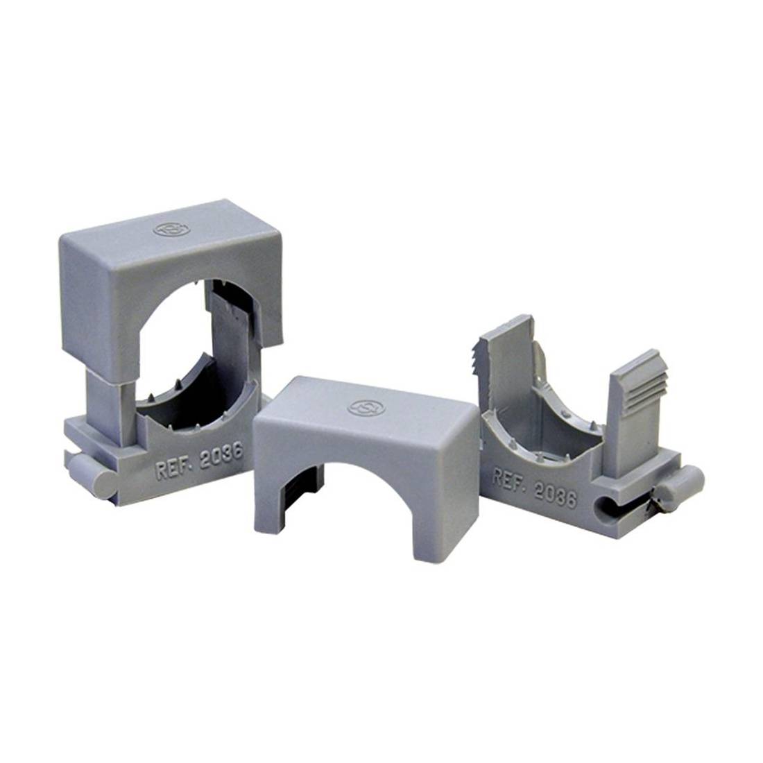Supporto per il fissaggio di tubi in plastica tramite l'incastro a pressione della parte superiore. Possibilità di collegare fra loro i supporti mediante un sistema di incastro laterale. Graffetta in nylon poliammide 6.6. Autoestrudente. Grigio RAL 7035.