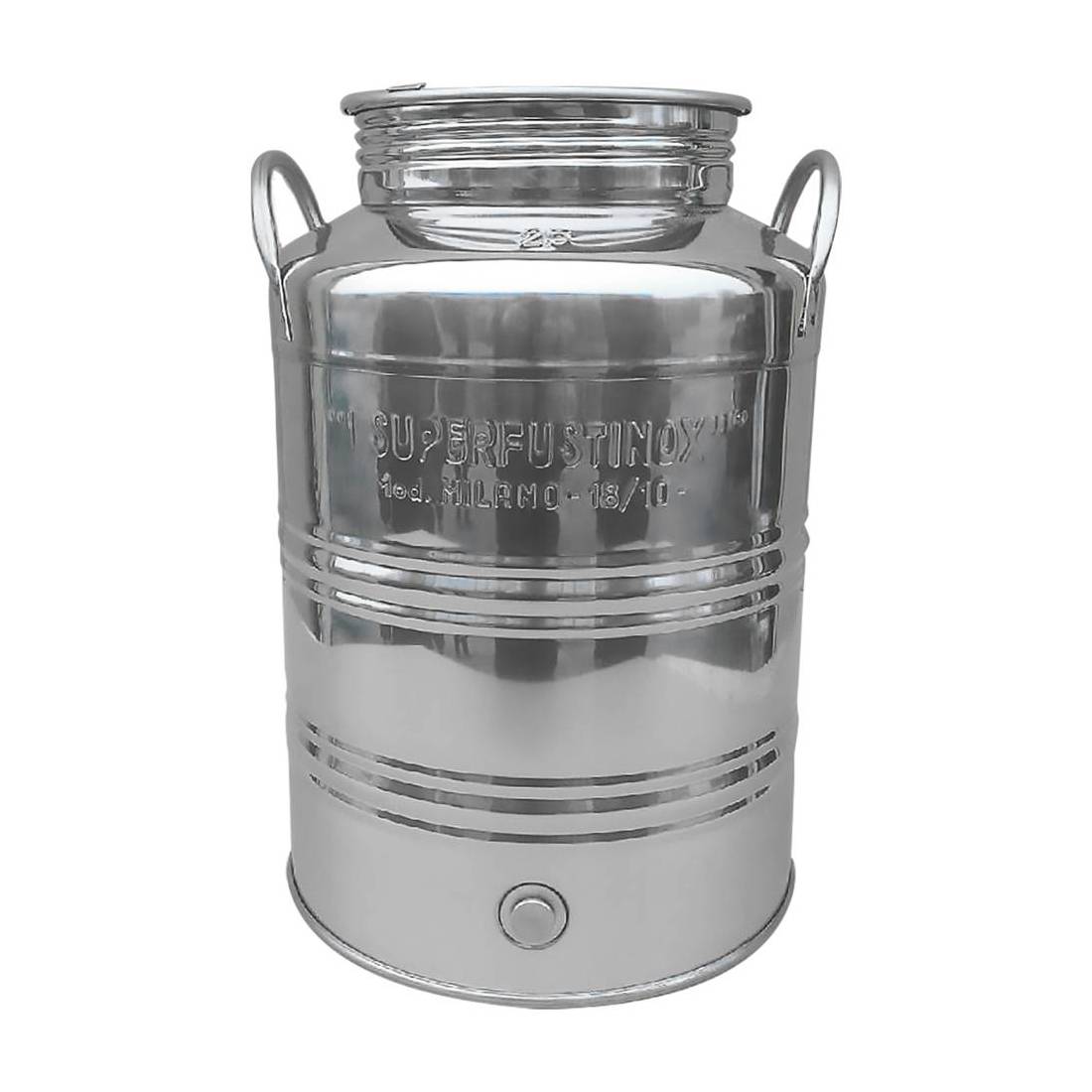 In acciaio inox 18/10 Aisi 304. Fondo aggraffato con tappo a vite a chiusura ermetica. Ampia apertura superiore (Ø 200 mm) che facilita il riempimento e la pulizia. Ideale per la conservazione di olio e per il trasporto di olio, vino e acqua. Predisposto per rubinetto 1/2. Fornito senza rubinetto.