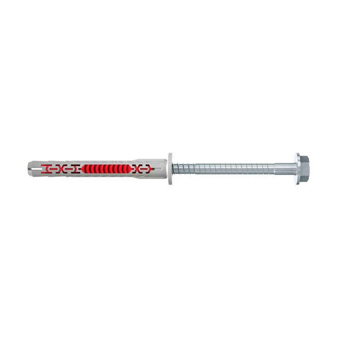 Vite zincata T.E. flangiata ad impronta Torx. In bimateriale a nervature laterali che impediscono la rotazione nel foro. Evita fratture in materiali porosi e cavi e permette l'installazione in prossimità dei bordi, rendendolo perfetto per le costruzioni in legno e il fissaggio di porte, finestre e ringhiere. Il corpo principale in nylon grigio di alta qualità, garantisce la resistenza a carichi elevati, mentre la componente rossa assicura flessibilità ed espansione ottimale. La certificazione ETA garantisce tenuta sicura in tutte le classi di materiali da costruzione.