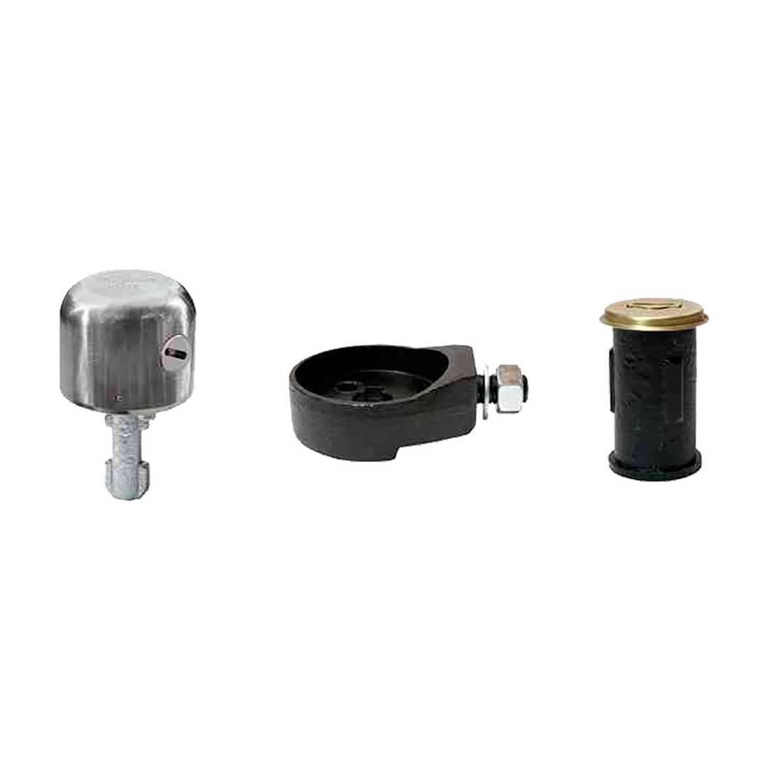 Per serrande. Corpo corazzato in acciaio inox. Accessoriato di base bloccaggio in acciaio pressofuso, perno di ancoraggio, cilindro intercambiabile, 2 chiavi universali cromate.