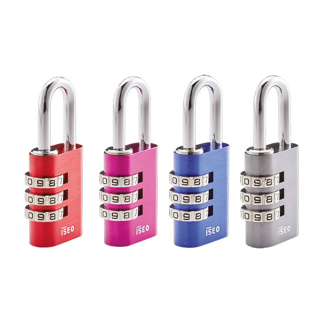 Combinazione variabile a 3 cifre. Adatto per valigie, zaini, armadietti. Corpo monoblocco in alluminio anodizzato, arco in acciaio temperato e cromato. Dimensioni: larghezza corpo 28,5 mm, altezza corpo 41,2 mm, larghezza arco 22,4 mm, altezza arco 26,8 mm, luce arco 12,4 mm.