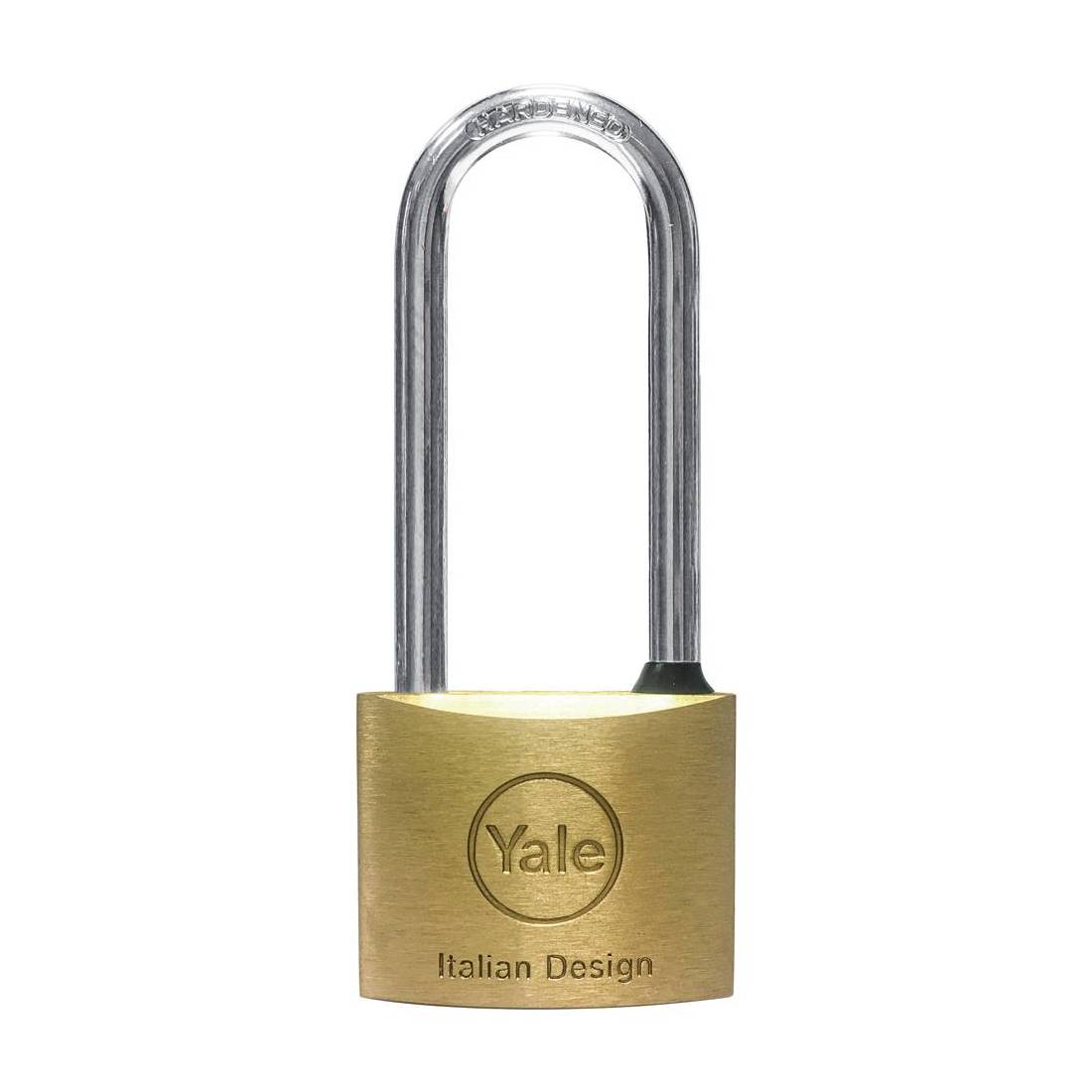 Corpo in ottone cromato, arco lungo in acciaio temprato. Con due chiavi.