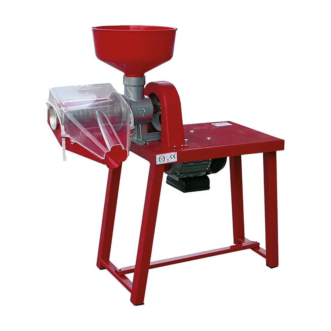 Macchina per la trasformazione del pomodoro. Corpo macchina e ghiera in alluminio UNI 50 pressofuso brillantato per alimenti. Trasportatore a vite in PA. Albero in acciaio. Trasmissione con puleggia a cinghia trapezoidale. Filtro in ferro stagnato. Gocciolatoio, imbuto e pestello in polipropilene copolimero per alimenti. Tavolo da lavoro in acciaio verniciato. Senza chiave smonta ghiera.