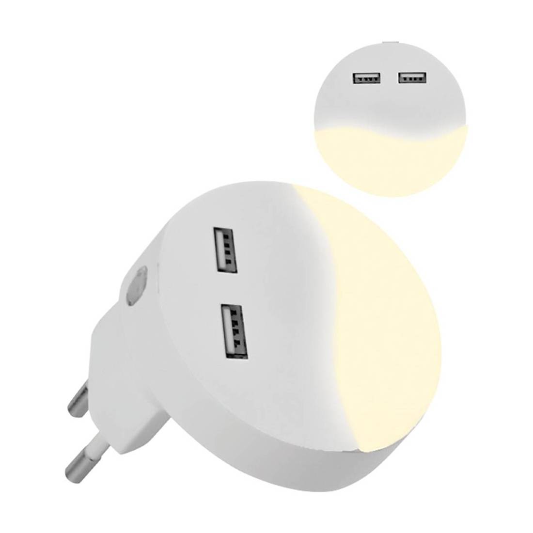 Con sensore crepuscolare e 2 porte USB. Realizzata in ABS e policarbonato di colore bianco, ha una forma rotonda e molto compatta. L'alimentazione è di tipo diretta da rete elettrica tramite spina 10A 2P integrata. Fascio luminoso diffuso e flusso di 10 lm, con copertura opaca. Dimensioni: mm 67x58, protezione IP20.