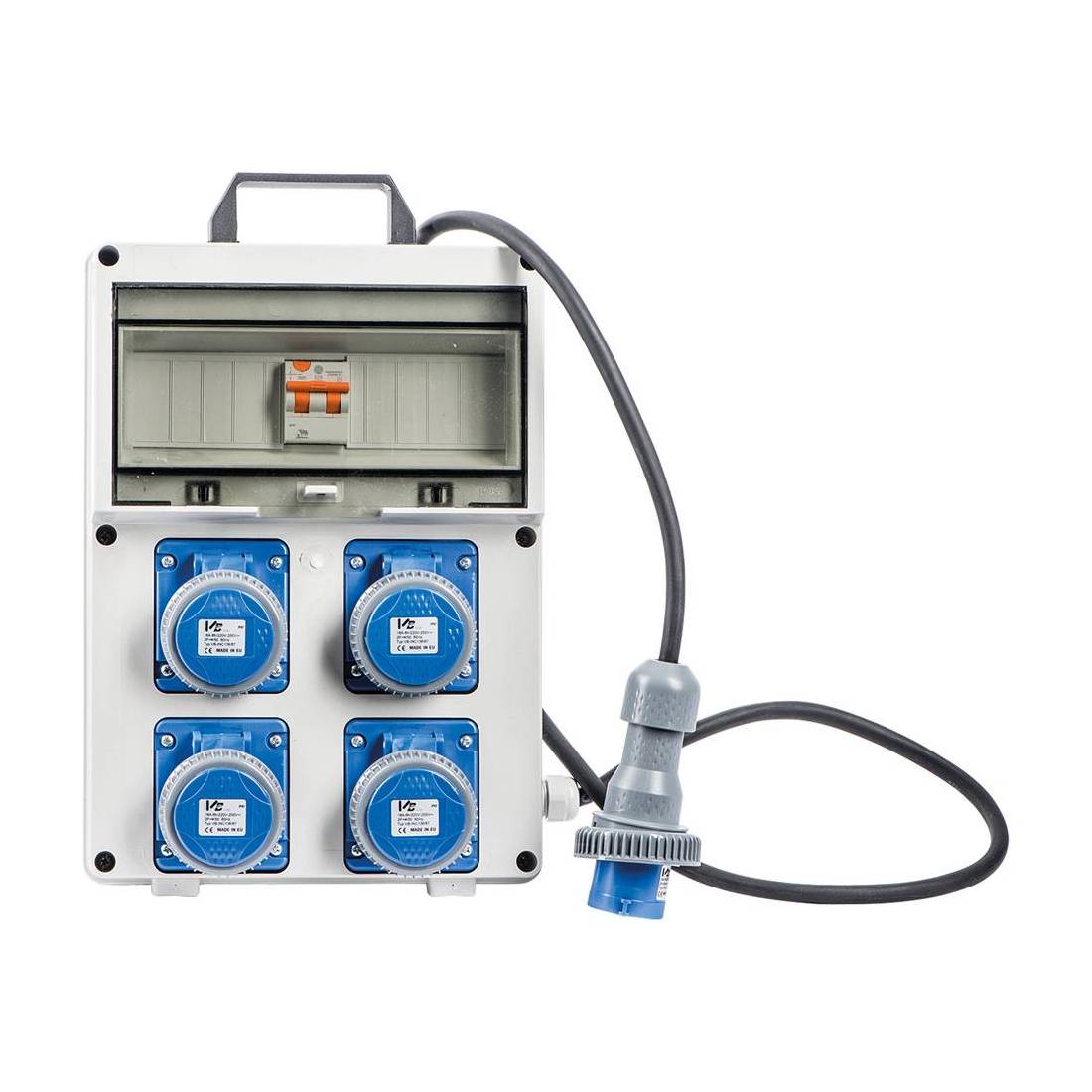 Realizzato in termoplastico per migliore rispondenza agli urti, escursioni termiche e raggi ultravioletti. Indicato nei cantieri di lavoro per la messa in funzione di attrezzature professionali. Con interruttore differenziale magnetotermico. Cavo in gomma: mt. 2 - 3x2,5 H07RN-F. Spina: 2P + T 16A - 230V. Prese: 4x2P + T 16A 230V. Protezione IP67.