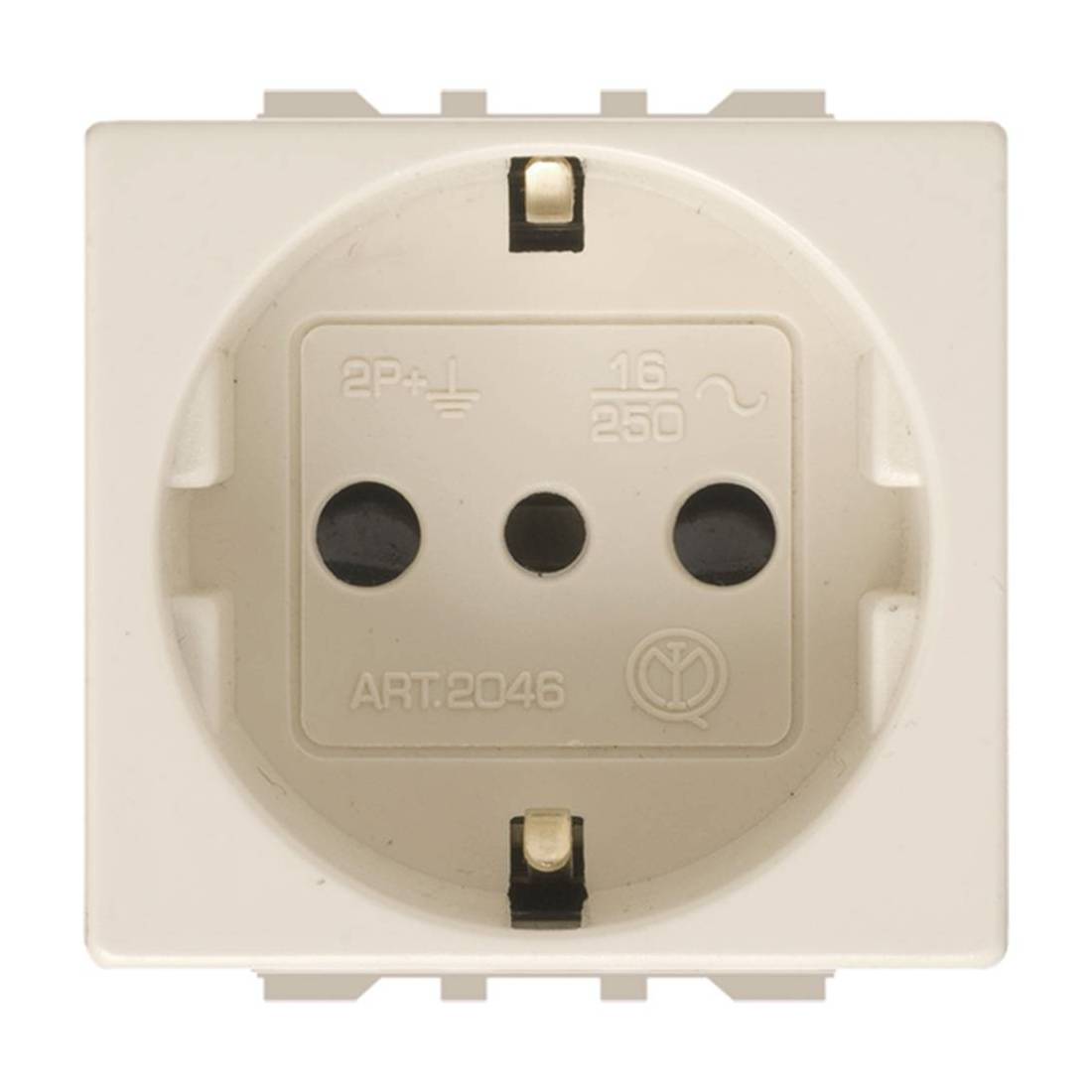 Presa Unel 2 poli + terra centrale con sicurezza. Standard italiano P30. Compatibile con tutta la serie Laser (Click, Alluminio, Vero Legno, Tondò e Tocco) e con le serie Magic International Bticino. Certificazione IMQ.