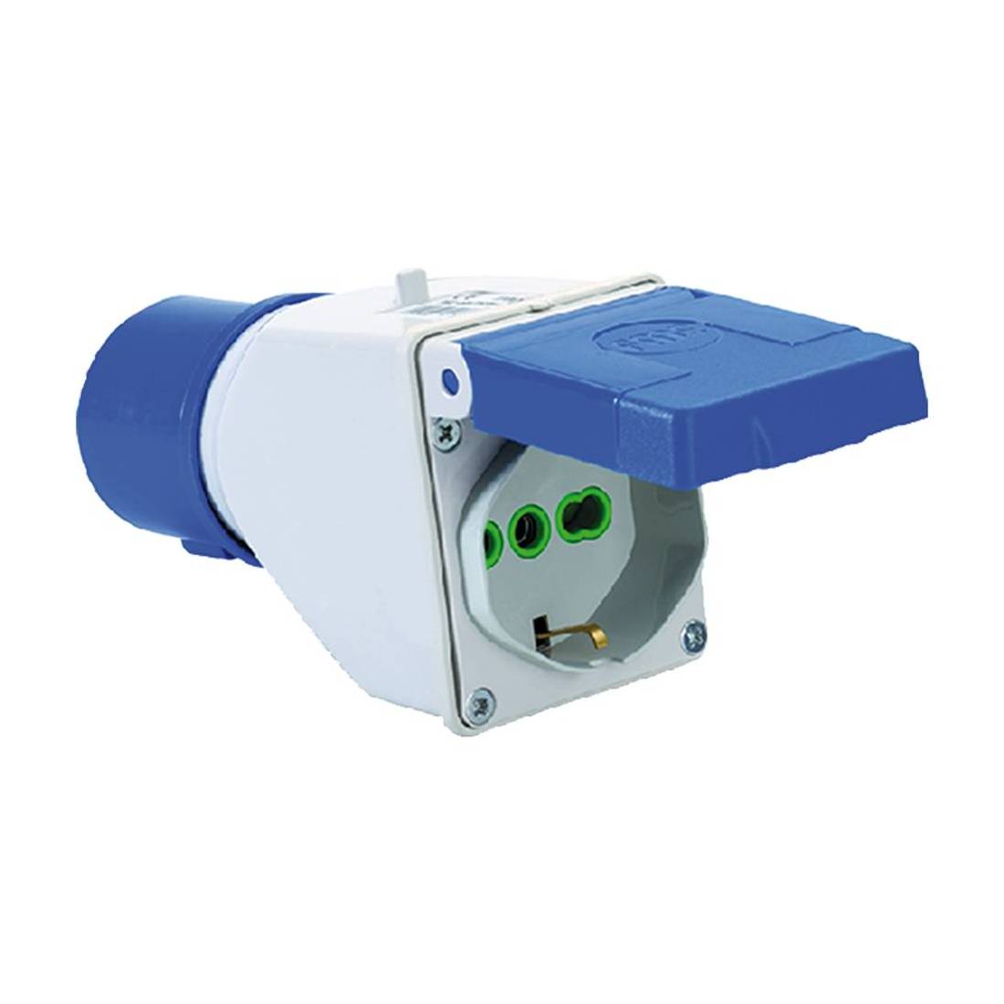 Spina: 2P + T 16A CEE blu - IP44. Presa: 2P + T 16A bipasso schuko - IP44.