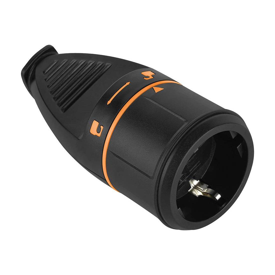 Dotata di meccanismo di blocco brevettato aperto/chiuso che, una volta azionato, permette di lavorare senza disconnessioni accidentali dell'apparecchio collegato. Connessa alla spina, è in grado di resistere per 30 secondi ad una forza di trazione pari a 120N (12 kg di sollevamento). Prodotto altamente sicuro, certificato TUV Rhineland GS. Potenza massima 3500 W, 250V. A cablaggio rapido.