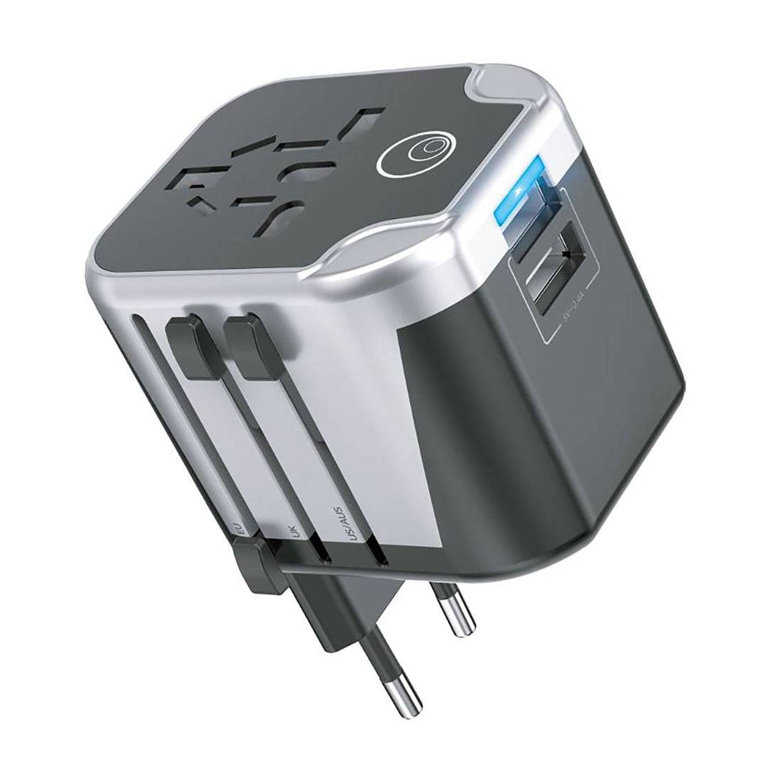Spina di conversione multi-paese, indicatore di carica. Materiale PC ignifugo. Protezione a piu' circuiti, doppia uscita USB. Fusibile di ricambio integrato. Presa AC dotata di connettori EU/UK/US/AUS. Indicato per smartphone, tablet, macchine fotografiche, navigatori. Colori assortiti.