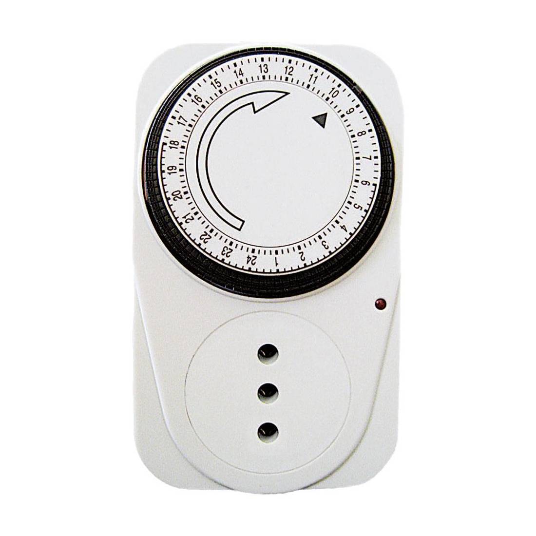 Timer a disco a settori multipli. Permette di programmare le fasce orarie entro le quali il carico collegato sara' attivo. Carico massimo 3500W.