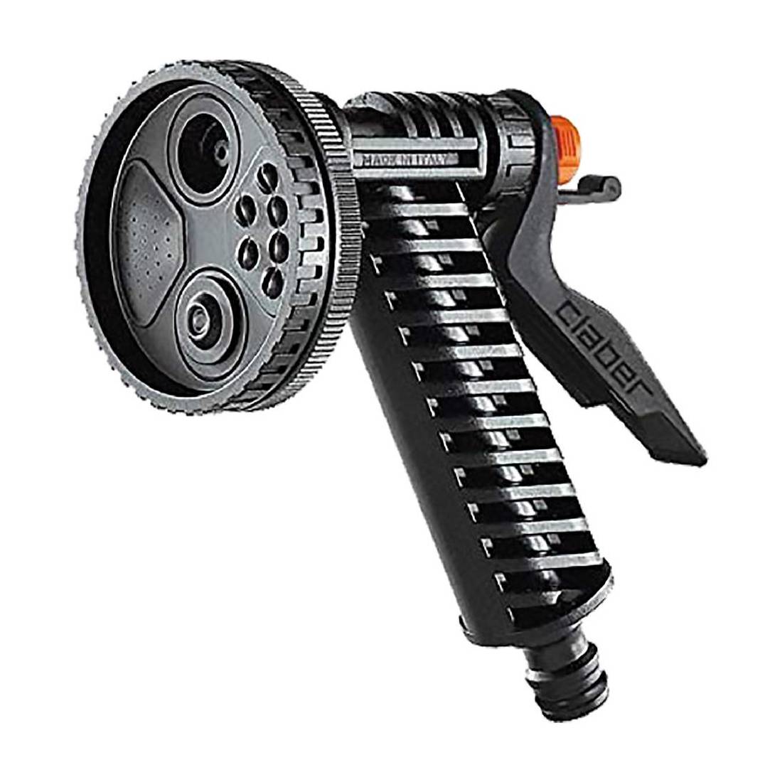 Tipo multigetto. Ruotando la testa della pistola si ottengono getti diversi: da diffuso a concentrato, annaffiatoio, nebulizzatore, doccia. Dispositivo per variare o bloccare il flusso. Impugnatura ergonomica antisdrucciolo.