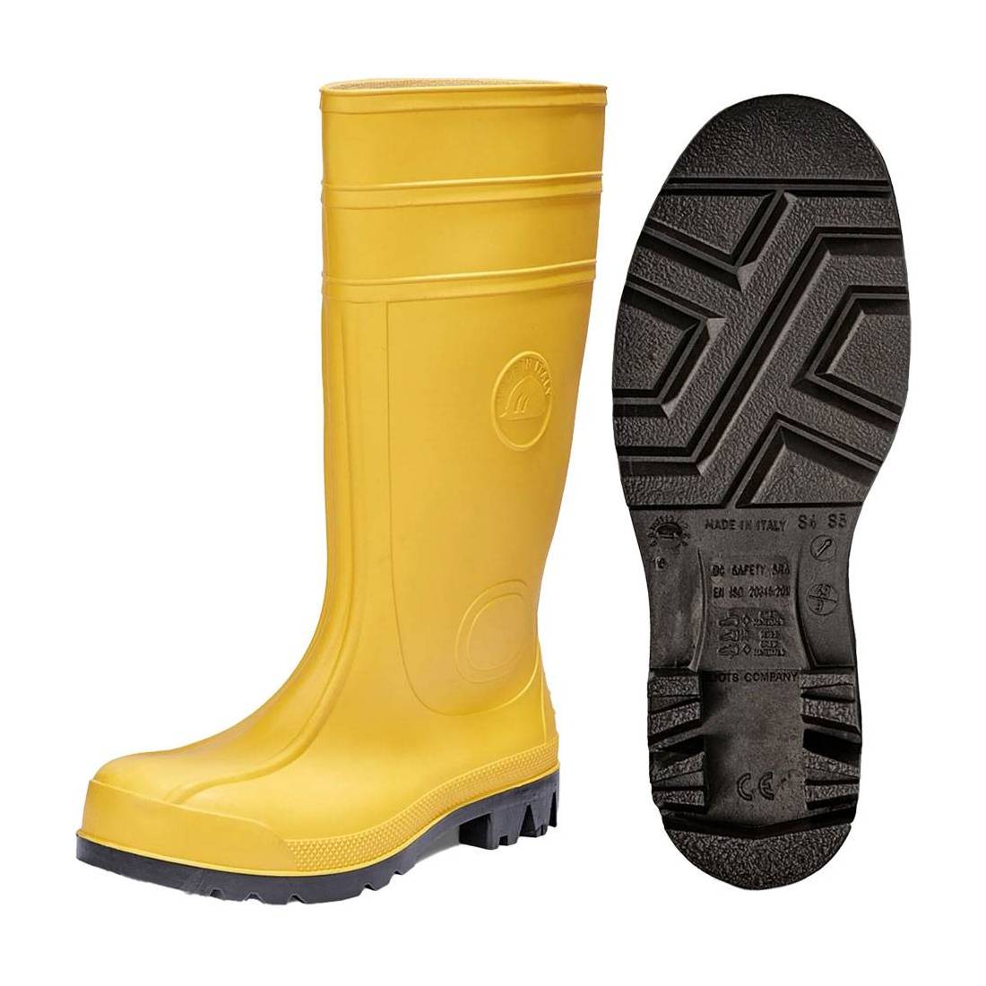 In PVC, fodera interna in maglia cotone. Puntale e suoletta in acciaio, suola grigia. A norme CE EN ISO 20345. Protezione S5.