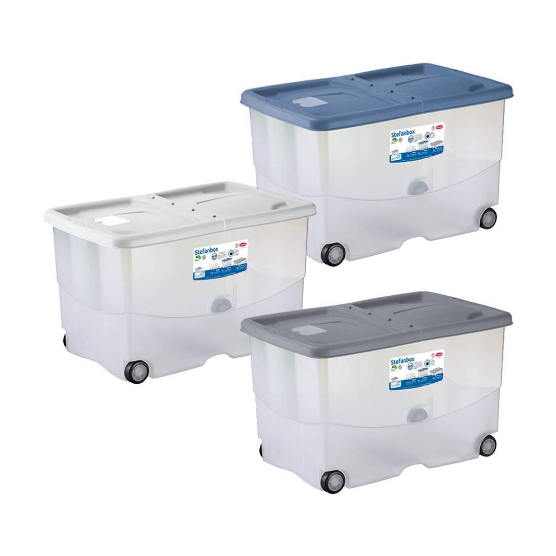 In PVC. Con ruote e coperchio a doppia apertura. A tre colorazioni assortite (silver/trasparente - blu/trasparente - verde/trasparente).