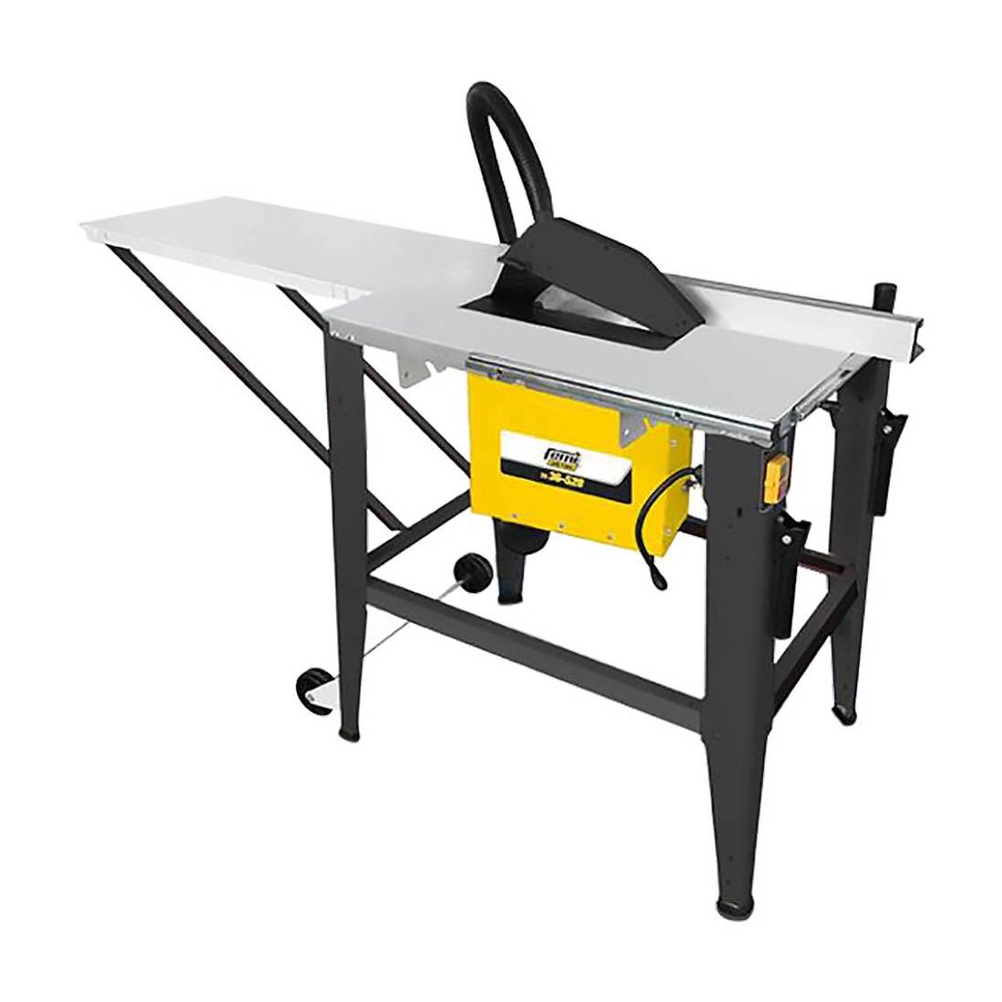 Basamento provvisto di ruote e con maniglie per il trasporto, piano appoggio e scorrimento delle tavole. Altezza massima taglio a 0 gradi: mm. 83, altezza massima di taglio a 45 gradi: mm. 49. Estensioni laterali 800x400 mm, lunghezza piano prima/dopo la lama 260/970 (con estensione). Guida parallela. Motore induzione. Tensione 230V-50Hz. Peso 46 kg. Dimensione piano di lavoro 800x550 mm. Adatta per il taglio di tavole e pannelli in cantieri edili e laboratori di falegnameria.