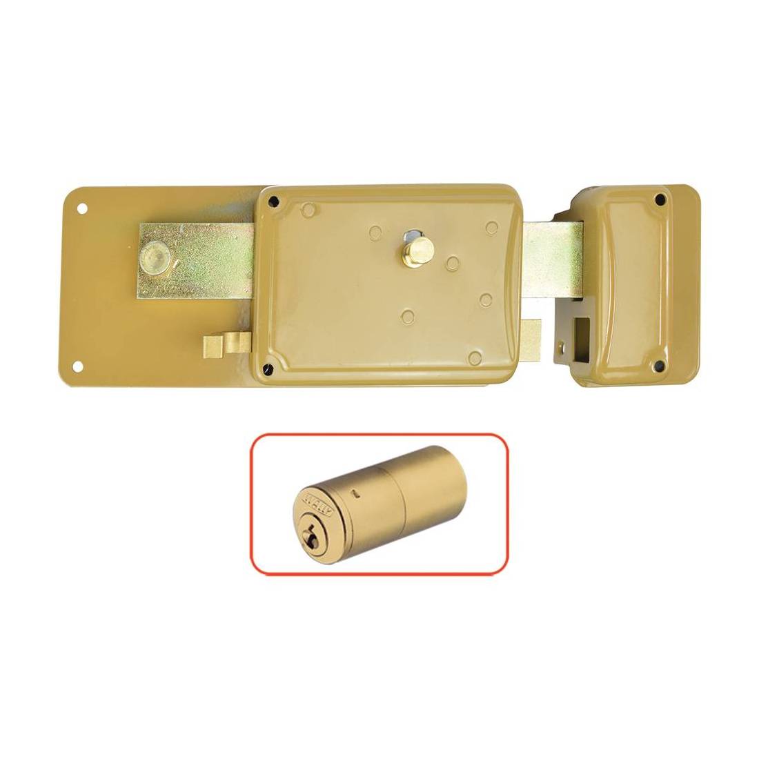Cilindro fisso esterno e scrocco separato. Pomolo interno, cilindro a 5 pistoncini (2 antimanipolazione). Scatola a finitura verniciata elettrostaticamente con polvere epossidica color nocciola mm. 209x90. Completa di 3 chiavi in ottone nichelato, bocchetta, borchia e viti di fissaggio. In scatola.