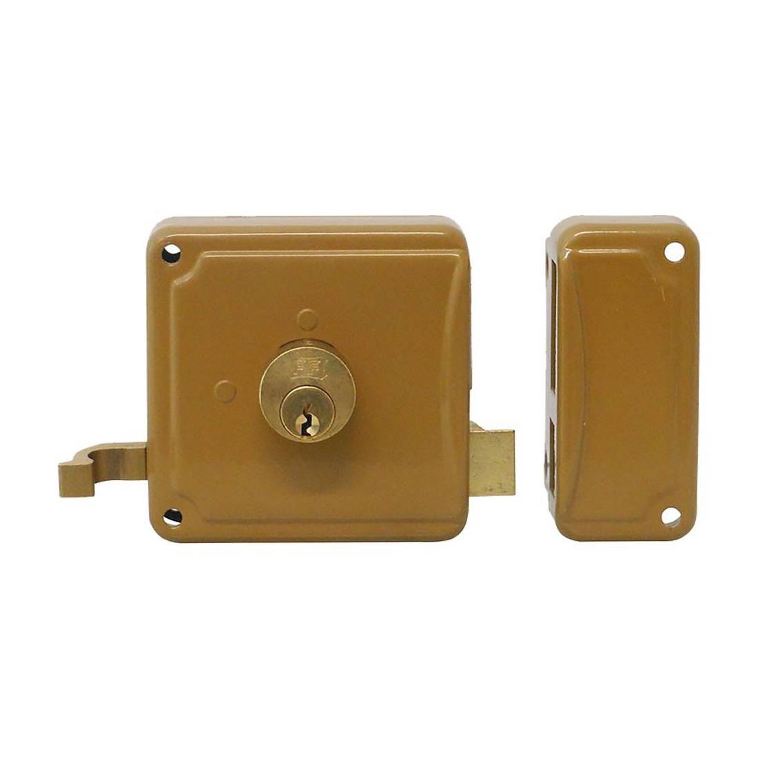 Cilindro doppio fisso: interno a 3 pistoncini ed esterno a 5 pistoncini. Scrocco e catenaccio. Scatola a finitura verniciata elettrostaticamente con polvere epossidica color nocciola. Completa di 3 chiavi in ottone nichelato, bocchetta, borchia e viti di fissaggio. In scatola.