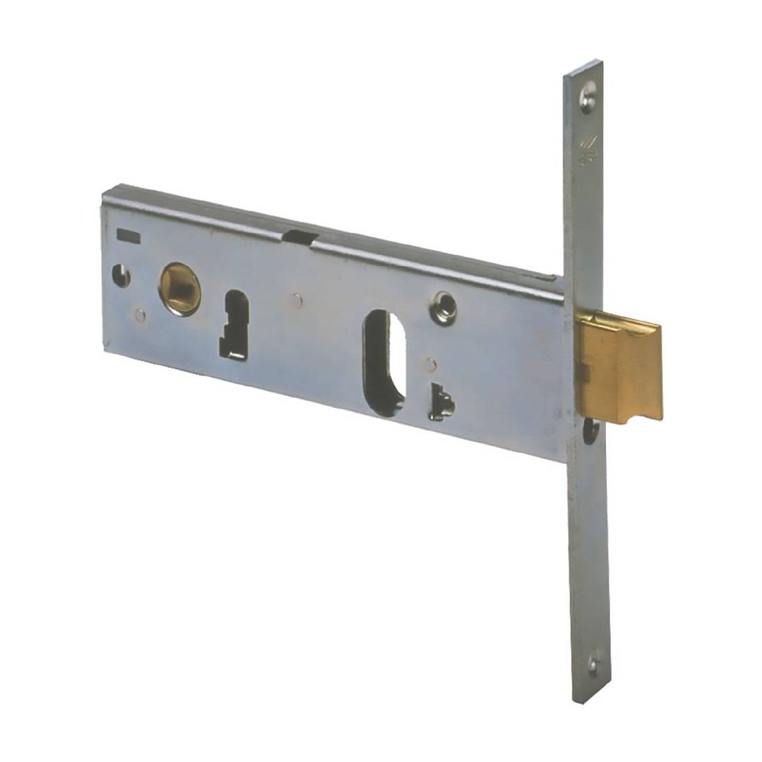 Foro cilindro europeo ovale. Con scrocco e catenaccio incorporato. Scatola e frontale zincato. Scrocco in ottone, altezza scatola 44 mm, 2 mandate. Quadro maniglia mm 8. Dotazione vite di fissaggio cilindro. Senza cilindro.