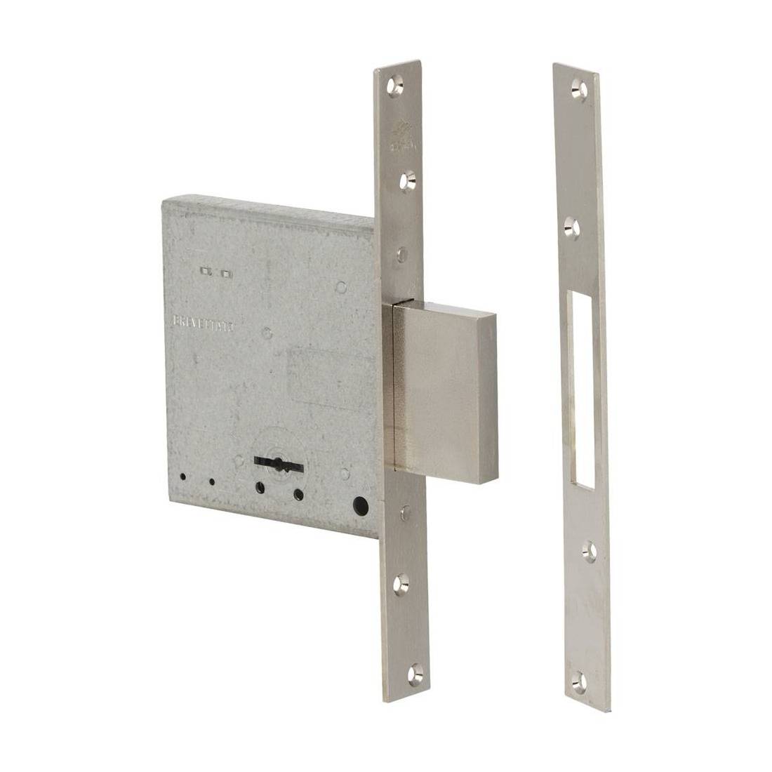 Scatola in acciaio con rivestimento in zinco, frontale e contropiastra in acciaio satinato nichelato. Catenaccio acciaio nichelato. A 4 mandate, frontale 25 mm. Dotazione viti fissaggio, 3 chiavi, contropiastra, copritoppa.