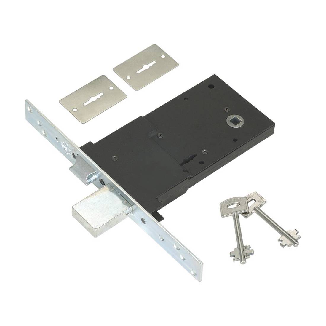 Frontale bordo quadro mm 25x240. Finitura zincata bianca, catenaccio in acciaio nichelato a 4 mandate e scrocco reversibile. Corsa catenaccio 40 mm. Quadro mm 8. Dotata di due bocchette. Con 3 chiavi.