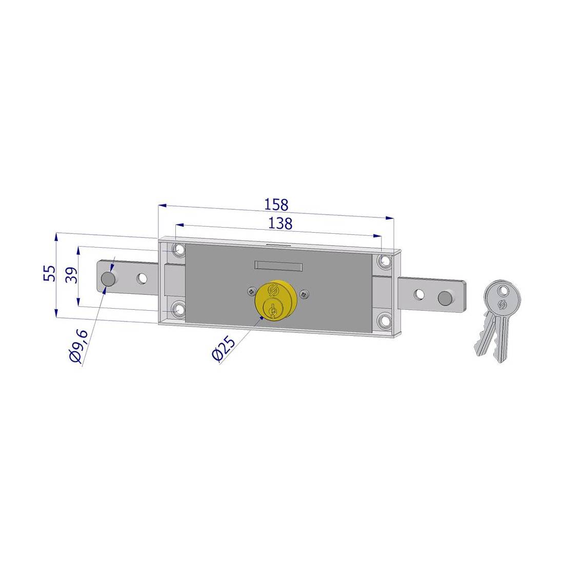 Cilindro tondo Ø 25 mm. A due punti di chiusura e due mandate. Scatola mm 55x157. Finitura zincata bianca.