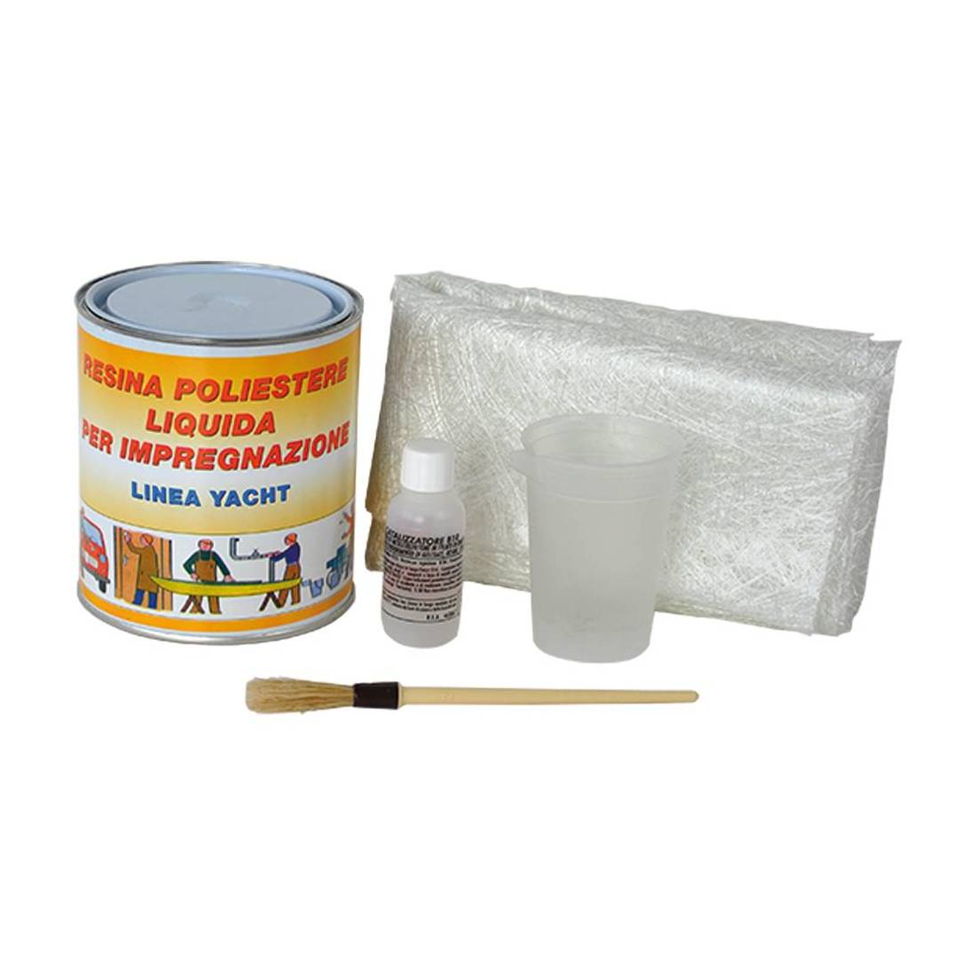 Adatto per riparazione e rifacimento di parti mancanti nel campo della carrozzeria e nautica. Contenuto: 750 ml di resina poliestere, 0,5 mq di lana vetro, 1 pennello, 1 bicchiere.